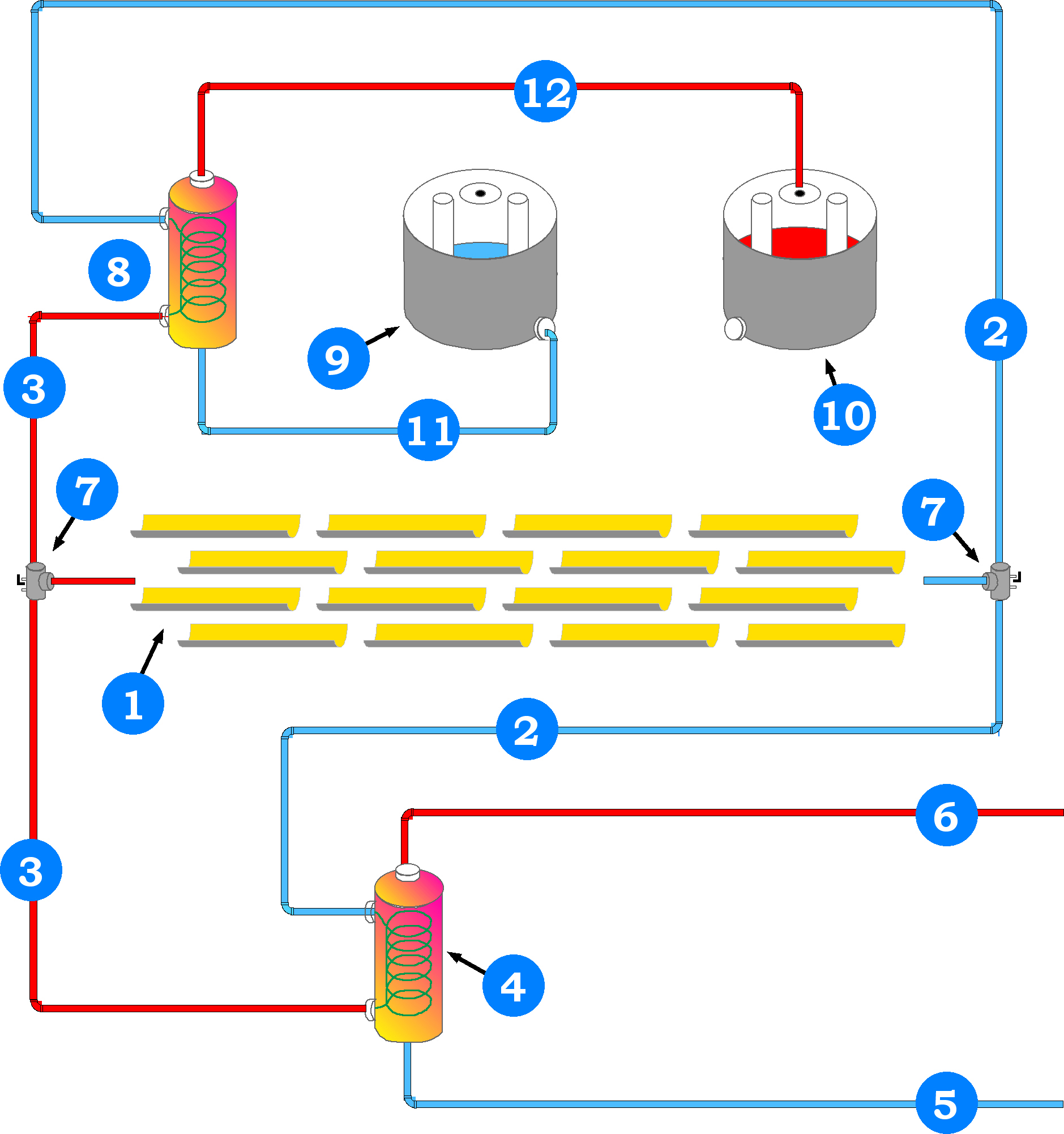 L'énergie solaire concentrée par le collecteur cylindro-parabolique est absorbée par un fluide de transfert qui transite à l’intérieur d’un tube métallique recouvert d’un revêtement "sélectif", placé sous vide à l'intérieur d'un autre tube en verre, lui même placé à la focale du collecteur cylindro-parabolique. Le fluide de transfert peut être ainsi chauffé à des températures d'environ 400°C, il est en permanence pompé à travers des échangeurs de chaleur conventionnels qui constituent le point de livraison de la chaleur à la transformation thermodynamique ultérieure de l’énergie solaire collectée, comme par exemple la climatisation solaire, la désalinisation solaire .... |