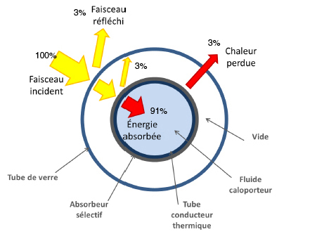 Le tube récepteur est placé à la focale (linéaire) du miroir cylindro parabolique et l’espace interne entre le tube en verre et le tube métallique absorbeur est maintenu sous vide pour éliminer les pertes thermiques par convection. |