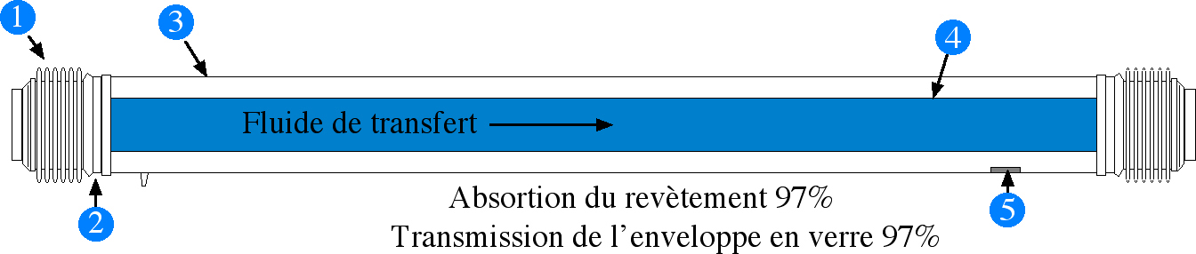 Le tube récepteur est le lieu de la conversion thermique de l’énergie solaire. Il est composé d’un ensemble sous vide d’un tube enveloppe en verre et d’un tube absorbeur en acier inoxydable recouvert d’une couche sélective dont le facteur d’absorption doit être le plus proche possible de l’unité. Le tube absorbeur doit avoir une conductivité, une diffusion thermique et une inertie chimique vis à vis du fluide de transfert (huile synthétique) qui va circuler en son sein appropriées. Il est muni à ses extrémités de soufflets métalliques qui font office de joints de dilatation. Le diamètre extérieur du tube absorbeur est fonction des dimensions du miroir associé. Le tube récepteur doit absorber autant de flux solaire concentré que possible, et le convertir énergie thermique, cette chaleur est transférée à un fluide |