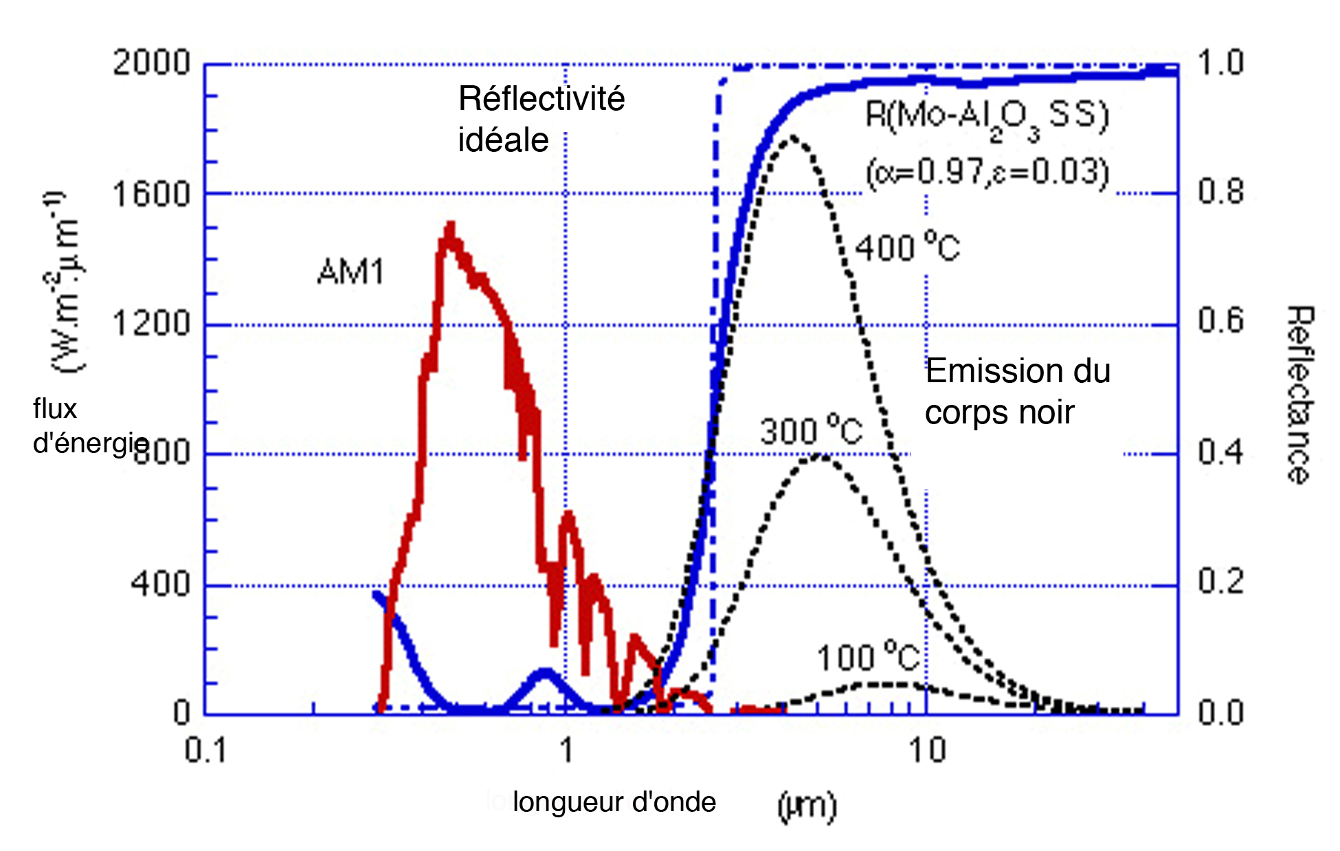 Les composites métal-diélectrique, aussi appelés cermet pour composite céramique-métal, sont constitués de particules métalliques dans une matrice diélectrique, déposés sur un substrat métallique. La partie cermet absorbe fortement dans le visible, du fait des transitions inter-bandes dans les particules métalliques et de la résonnance entre les particules, mais reste transparente dans l’infrarouge. La couche métallique inférieure joue le rôle de réflecteur infrarouge. |
