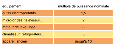 Pour la brève durée du démarrage, les appareils inductifs, écrans cathodiques, moteurs électriques... nécessitent une puissance multiple de leur puissance nominale. Il est nécessaire de choisir un convertisseur disposant d'une réserve de puissance suffisante. |