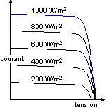 Une baisse de l’ensoleillement provoque une diminution de la création de paires électron-trou avec un courant à l’obscurité inchangé. Le courant du panneau solaire étant égal à la soustraction du photocourant et du courant de diode à l’obscurité, il y’a une baisse du courant solaire Icc proportionnelle à la variation de l’ensoleillement accompagnée d’ une très légère diminution de la tension Vco et donc un décalage du point Pmax du panneau solaire vers les puissances inférieures. |