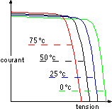 Une élévation de la température (de jonction) des cellules solaires provoque un important accroissement de leur courant à l’obscurité et facilite une légère augmentation de la création de paires électron-trou. Le courant du panneau solaire étant égal à la soustraction du photocourant et du courant de diode à l’obscurité, il y’a une légère augmentation du courant Icc accompagnée d’une forte diminution de la tension Vco et donc un décalage du point Pmax vers les puissances inférieures. |