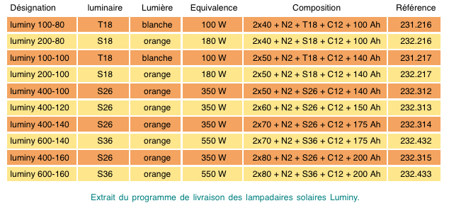 Le lampadaire solaire Luminy assure l’éclairage rationnel de points isolés en alliant efficacité et économie. La lumière est soit blanche ( tube fluorescent) pour l’éclairage de type urbain soit orange (lampe sodium) pour les infrastructures industrielles et routières. Les tubes fluorescents et lampes sodium assurent 8 000h de fonctionnement et sont disponibles worldwide. Un Luminy est livré avec sa console de fixation du luminaire pour Ø 60 mm et une batterie box PVC à attacher au poteau de fixation. |