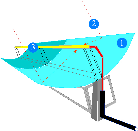 perpendiculaire au réflecteur. De cette manière, la radiation est réfléchie au foyer de la parabole et concentrée sur un tube récepteur dans lequel circule le fluide caloporteur.. L’ensemble du concntrateur cylindro-parabolique est mobile, il est orienté selon un axe nord-sud et suit la course du soleil d'Est en Ouest. |
