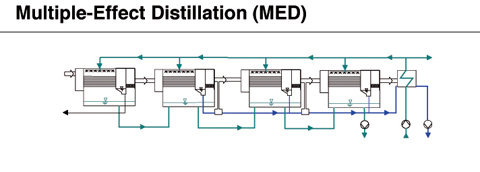 Les évaporateurs multiples à tubes horizontaux arrosés sont les appareils les plus courants. Dans ces appareils, le fluide moteur (vapeur d’eau distillée )s'écoule dans les tubes horizontaux tandis que l'eau de mer à évaporer est pulvérisée de façon à s'écouler sous forme de film le plus mince et uniforme possible sur la surface extérieure des tubes dans une enceinte sous vide. La vapeur produite est ensuite transférée dans les tubes de l'effet suivant où elle cédera son énergie de condensation. Dans une cellule n de désalinisation MED, de l'eau de mer ruisselle sur des tubes chauffés grâce à la chaleur latente de condensation de la vapeur d’eau de l’effet n-1, une partie de cette eau de mer est vaporisée. L’eau de mer non vaporisée s'accumulant au fond de l’enceinte n et est expédiée à la partie supérieure de l’effet n+1. La vapeur d'eau distillée formée dans l’effet n est envoyée à l’intérieur des tubes de l'effet n+1, effet où règnent une température et une pression encore plus basses que celles de l'effet n et l’eau de mer non transformée en vapeur est envoyée dans la cellule n+1 où elle sera pulvérisée sur les tubes échangeurs de chaleur. La condensation de la vapeur d’eau à l’intérieur des tubes d’échange de l’effet n+1 libère suffisamment d'énergie thermique pour vaporiser en partie l'eau de mer qui ruisselle toujours sur les surfaces extérieures des tubes. La vapeur formée entre dans l’effet n+2 où le même processus se répète. Des évaporateurs multiples effets à plaques sont disponibles aussi. L'eau de mer à évaporer s'écoule alors sous forme de film mince le long d'une mince plaque métallique chauffée par la vapeur provenant de l'effet précédent qui s'écoule le long de l'autre face de la plaque métallique. De nombreuses plaques entre lesquelles s'écoulent alternativement l'eau de mer et la vapeur de chauffage sont associées en parallèle pour constituer un effet. La vapeur produite est recueillie et est ensuite envoyée entre les plaques situées dans une enceinte qui constitue le deuxième effet et ainsi de suite. L'agencement de cellules élémentaires pour que chaque zone d'évaporation se situe entre deux zones de condensation de l'effet précédent permet d'obtenir un appareil compact. |