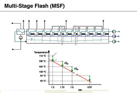 Ce système de désalinisation à détentes successives est constitué par plusieurs évaporateurs tous sous vide sauf le premier, tous en série, dans lesquels règnent des pression et des températures décroissantes du premier (le plus chaud et ayant la pression relative la plus élevée) au dernier (le moins chaud et caractérisé par la dépression la plus faible). En haut de chacune de ces enceintes, sont placés des tubes condenseurs horizontaux, transverses ou longitudinaux. L'eau de mer, pressérusée, circule d'abord à rebours à l’intérieur de ces tubes condenseurs en commençant par le dernier étage pour atteindre le premier étage où elle est portée à sa température sa température maximale de saumure de 110 °C grâce à l’apport d’un système à énergie solaire. Le trajet à rebours du dernier jusqu’au premier étage trouvant sa raison dans la récupération, aussi modeste soit elle de la chaleur de condensation de la vapeur d'eau libérée sur la surface extérieure de ces mêmes tubes lors du trajet amont de l’eau salée qui se fera, cette fois ci, à l’extérieur des tubes. Une fois que l’eau a été ainsi chauffée, elle retourne par les mêmes sections en ordre inverse mais à l’extérieur des tubes. |
